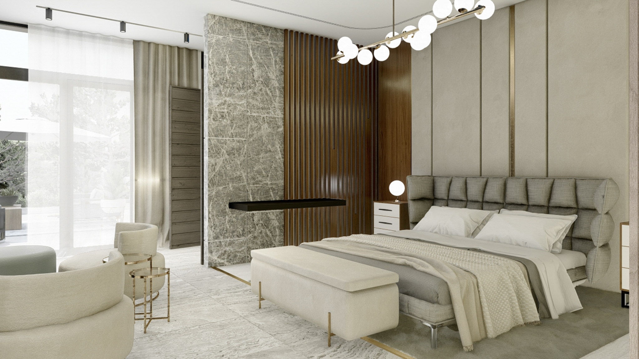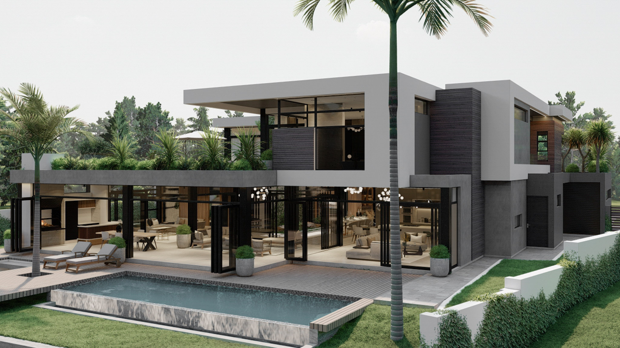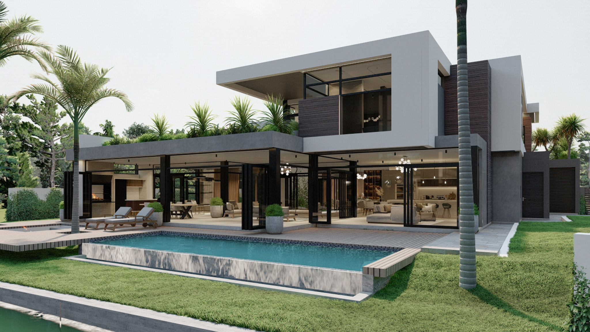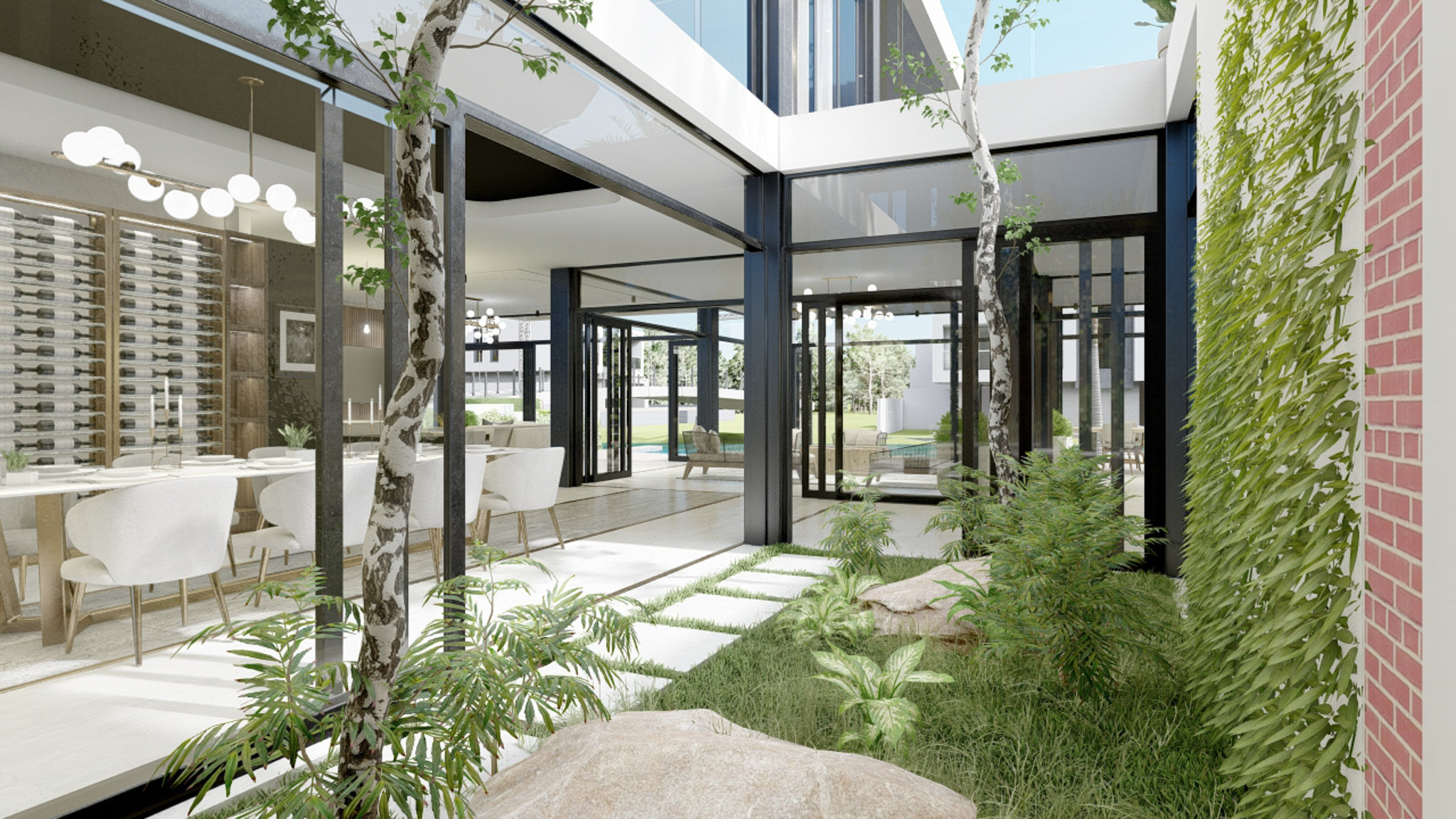 The planted upstairs balcony and interior courtyard garden provide additional green spaces for relaxation and add to the sense of peaceful tranquility that exists throughout this design. The balance between open and more private spaces accommodates for every type of lifestyle. Days spent splashing in the pool and lounging in the sun on the deck can flow seamlessly into nights spent entertaining friends and family on the patio and sitting by a crackling fire in the boma.