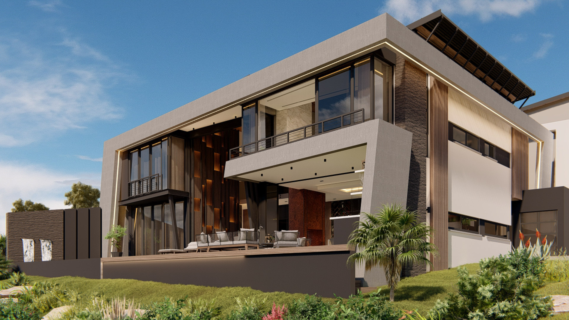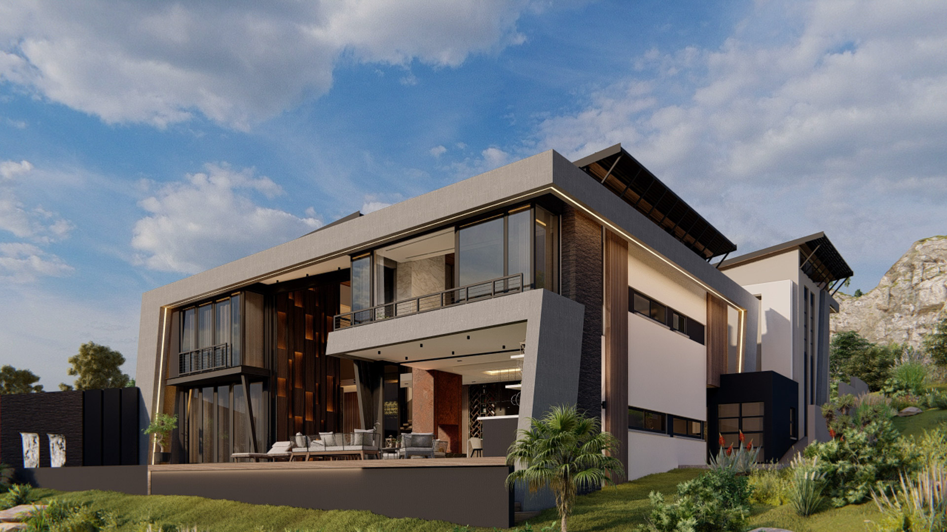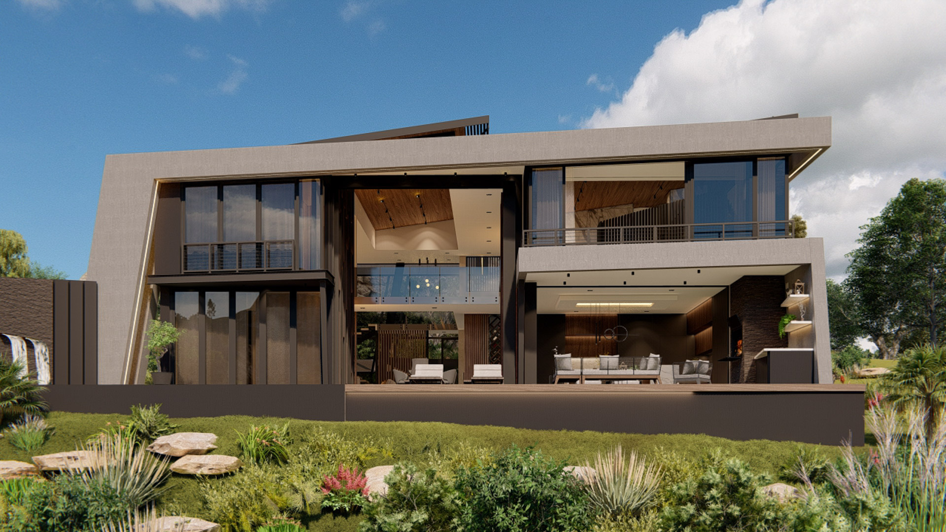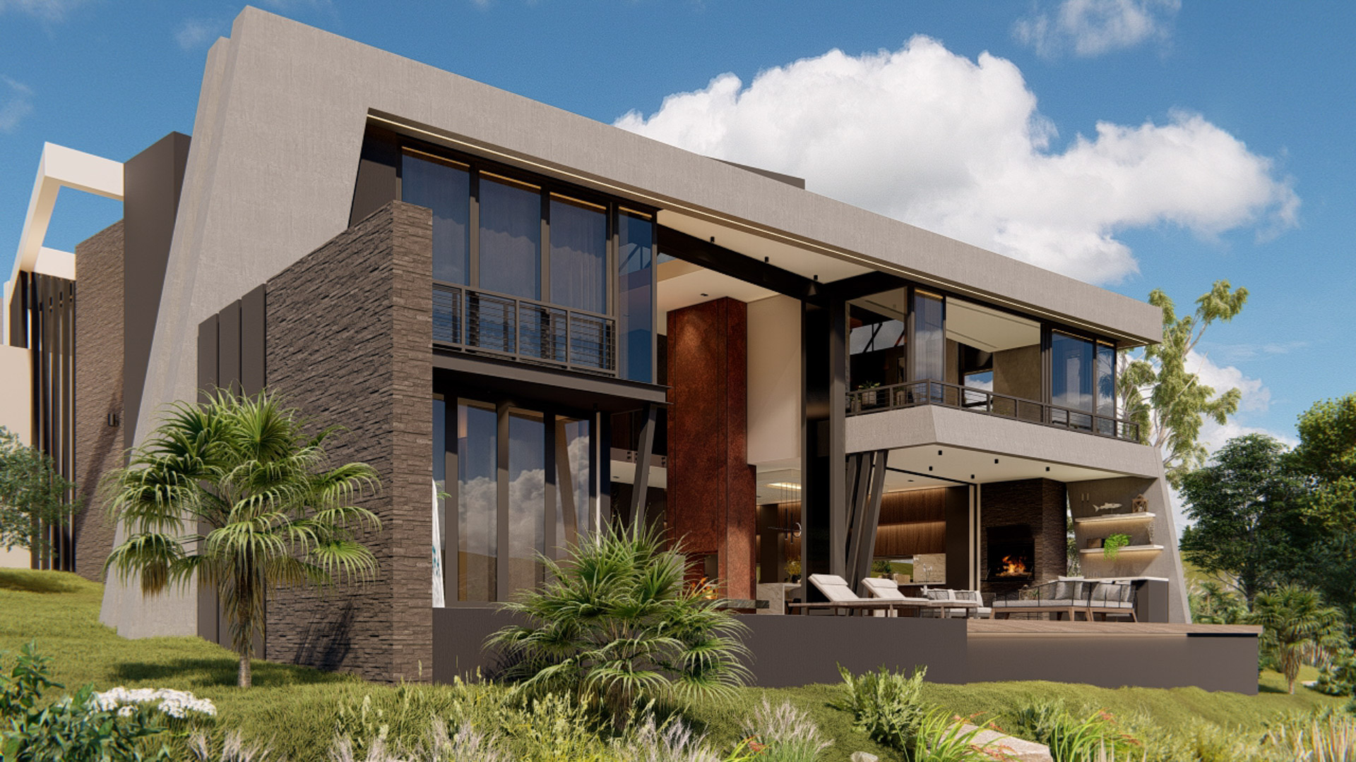 226 Mentoor Mountain Estate rises with a bold yet measured confidence, shaped by modern geometry and softened by warm, tactile materials. Positioned along the natural gradient of the mountain terrain, the home embraces its slope to create a layered living experience — where each level opens to light, long views, and the quiet rhythm of its surroundings. The architecture is defined by strong angled frames, deep overhangs, and expansive glazing that dissolves the threshold between inside and out. Timber panelling, textured stone, and sculptural steel elements introduce depth and tone, giving the façade a distinct presence without overwhelming the landscape. Inside, double-volume spaces lift the eye, while a central fireplace anchors the living areas with a rich, earthy glow. Outdoor living becomes an extension of the interior: a linear pool draws the home outward, sunken lounges invite slow afternoons, and generous terraces offer places for gathering, resting, or simply watching the mountain light shift across the day. Every detail is deliberate – from circulation flows to material contrasts – creating a home that is as expressive as it is livable.