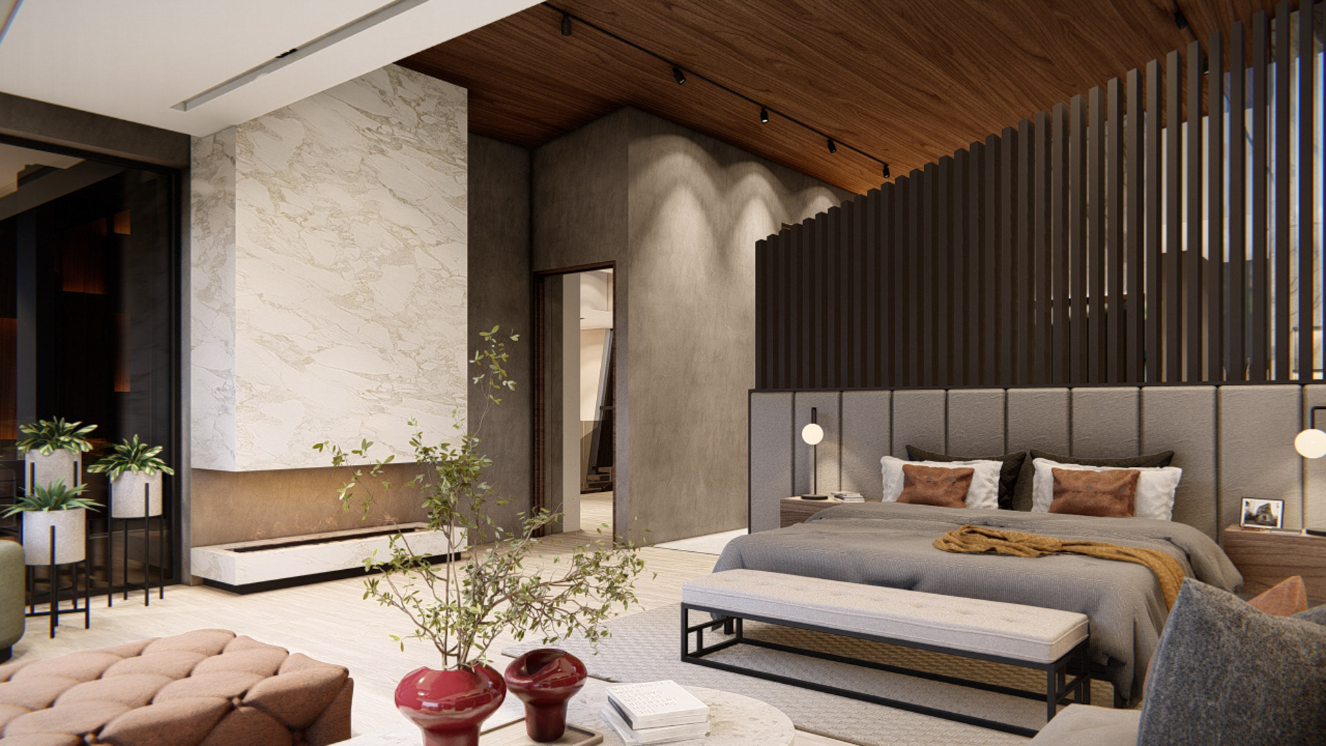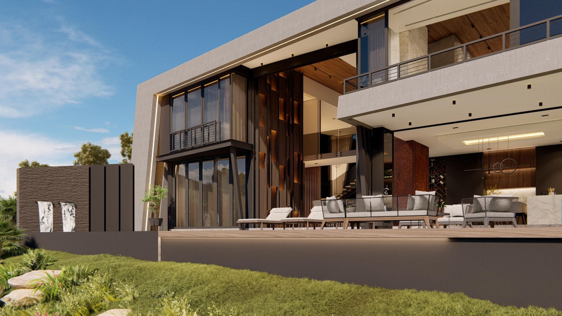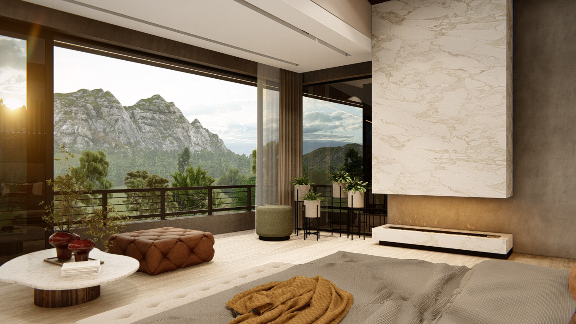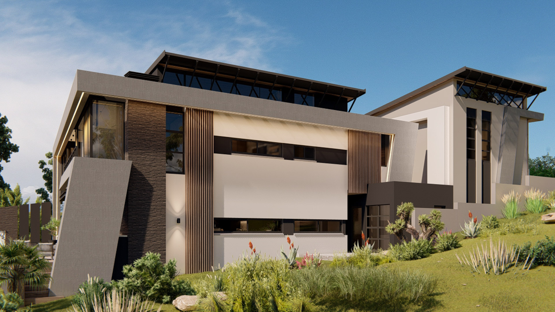 226 Mentoor Mountain Estate rises with a bold yet measured confidence, shaped by modern geometry and softened by warm, tactile materials. Positioned along the natural gradient of the mountain terrain, the home embraces its slope to create a layered living experience — where each level opens to light, long views, and the quiet rhythm of its surroundings. The architecture is defined by strong angled frames, deep overhangs, and expansive glazing that dissolves the threshold between inside and out. Timber panelling, textured stone, and sculptural steel elements introduce depth and tone, giving the façade a distinct presence without overwhelming the landscape. Inside, double-volume spaces lift the eye, while a central fireplace anchors the living areas with a rich, earthy glow. Outdoor living becomes an extension of the interior: a linear pool draws the home outward, sunken lounges invite slow afternoons, and generous terraces offer places for gathering, resting, or simply watching the mountain light shift across the day. Every detail is deliberate – from circulation flows to material contrasts – creating a home that is as expressive as it is livable.