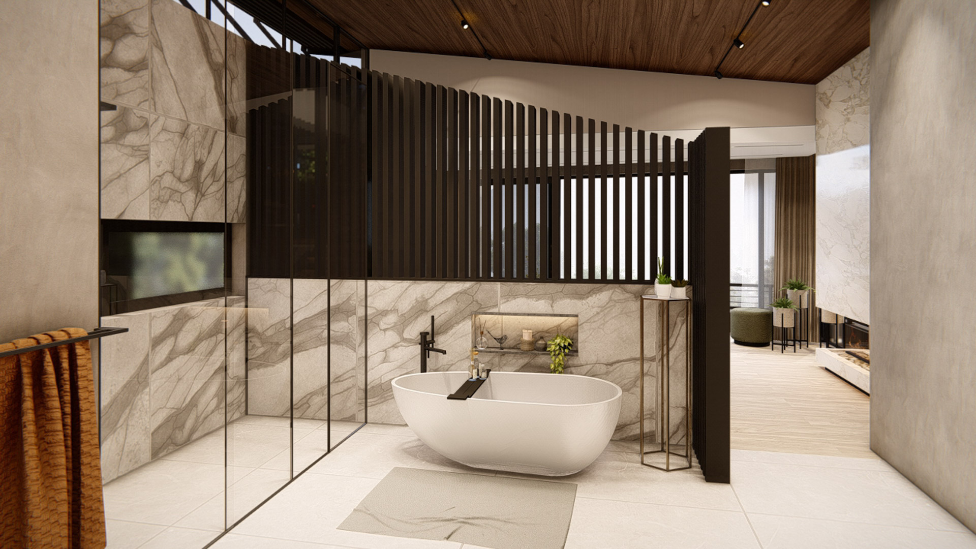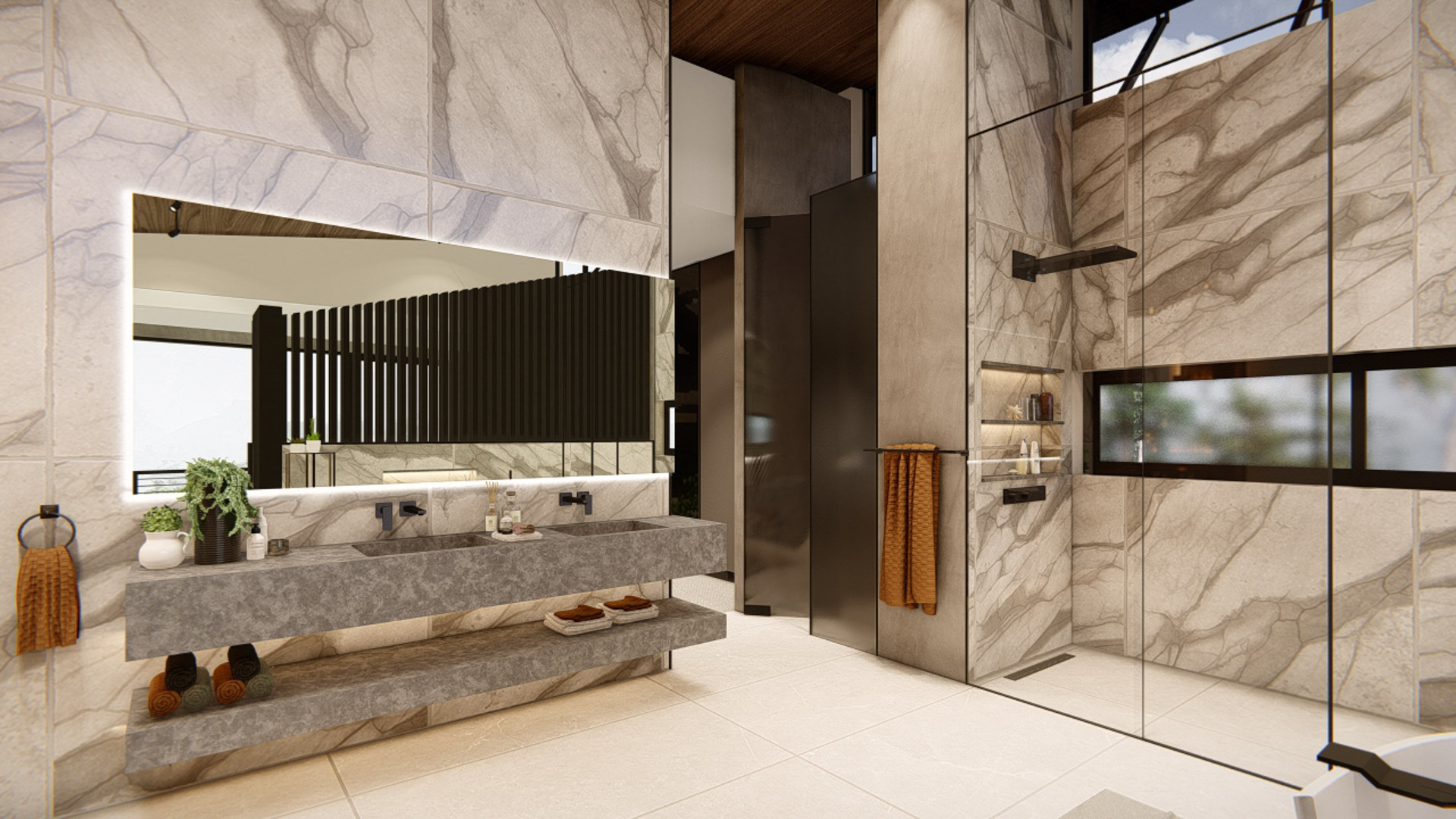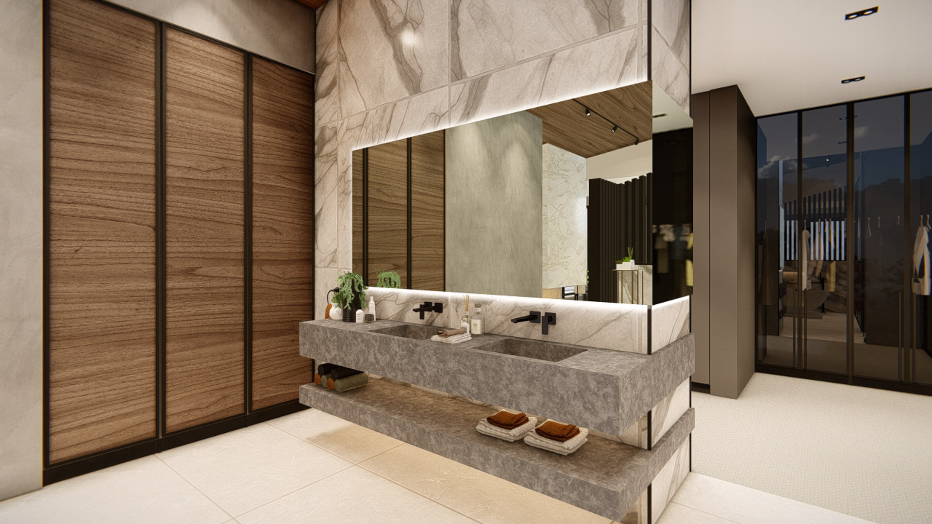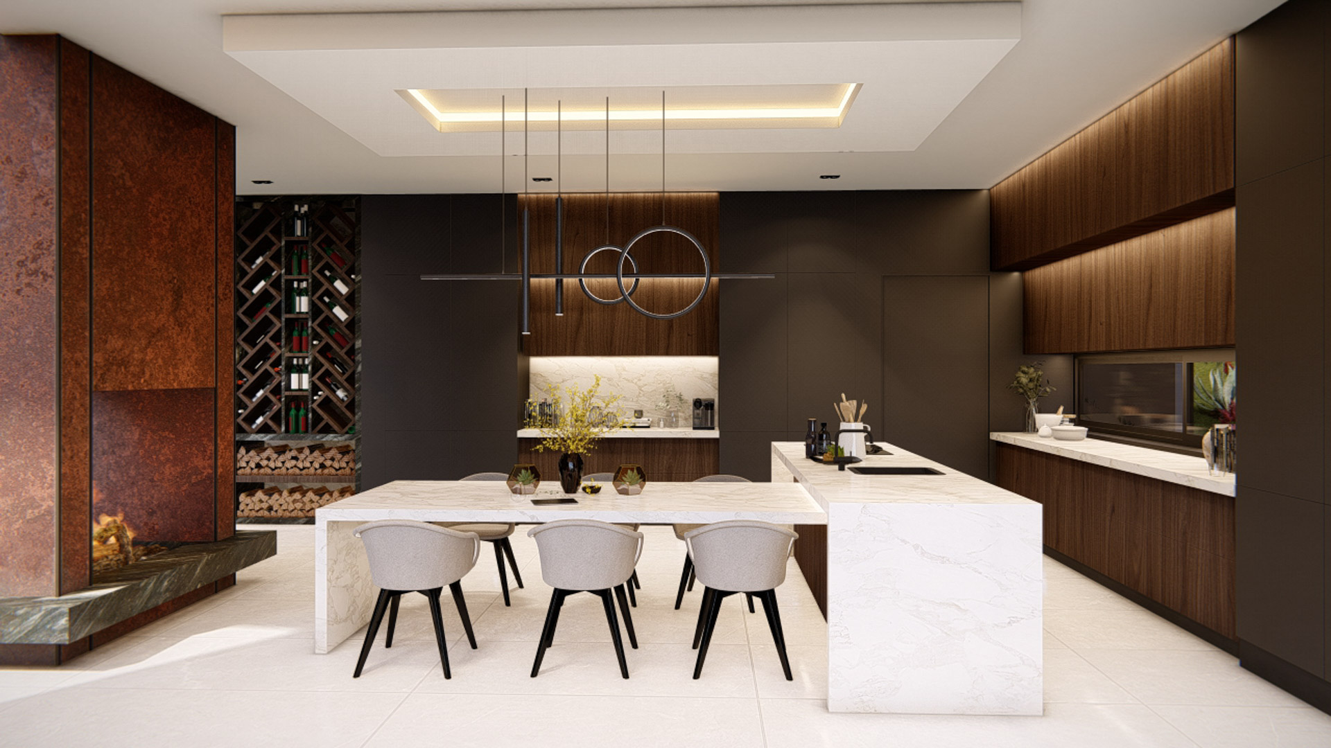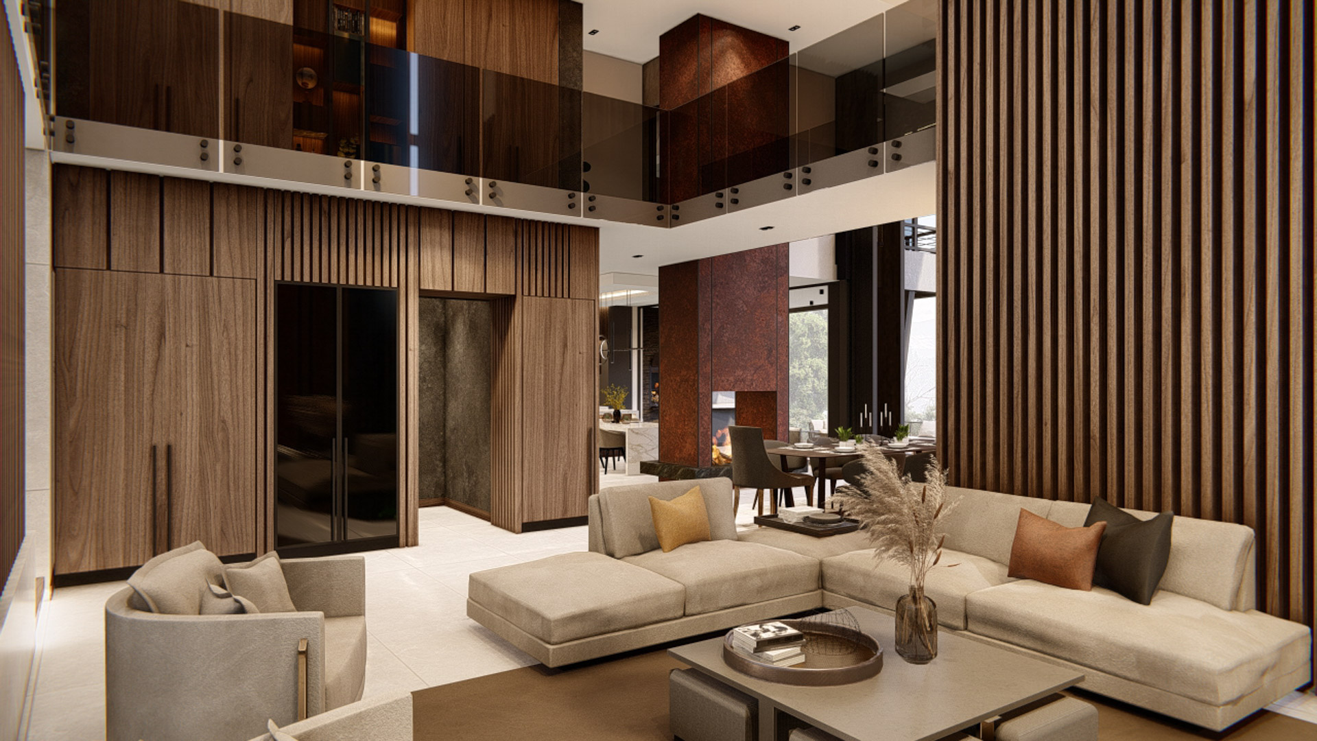 226 Mentoor Mountain Estate rises with a bold yet measured confidence, shaped by modern geometry and softened by warm, tactile materials. Positioned along the natural gradient of the mountain terrain, the home embraces its slope to create a layered living experience — where each level opens to light, long views, and the quiet rhythm of its surroundings. The architecture is defined by strong angled frames, deep overhangs, and expansive glazing that dissolves the threshold between inside and out. Timber panelling, textured stone, and sculptural steel elements introduce depth and tone, giving the façade a distinct presence without overwhelming the landscape. Inside, double-volume spaces lift the eye, while a central fireplace anchors the living areas with a rich, earthy glow. Outdoor living becomes an extension of the interior: a linear pool draws the home outward, sunken lounges invite slow afternoons, and generous terraces offer places for gathering, resting, or simply watching the mountain light shift across the day. Every detail is deliberate – from circulation flows to material contrasts – creating a home that is as expressive as it is livable.