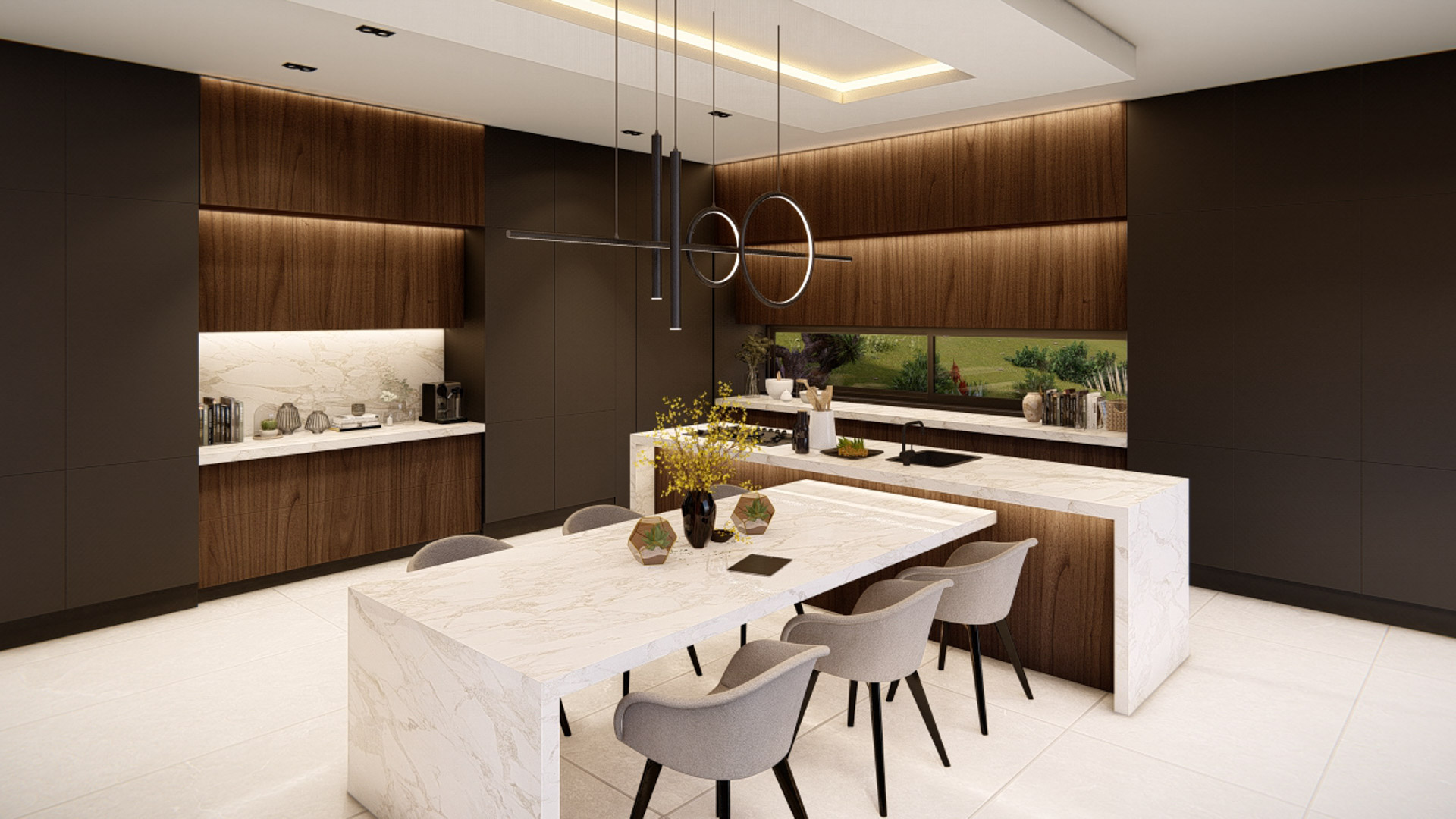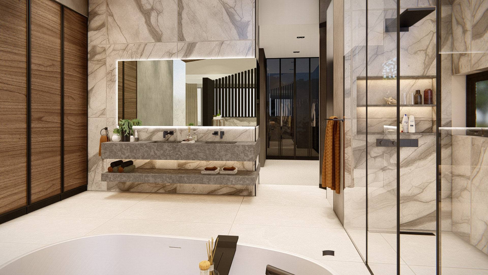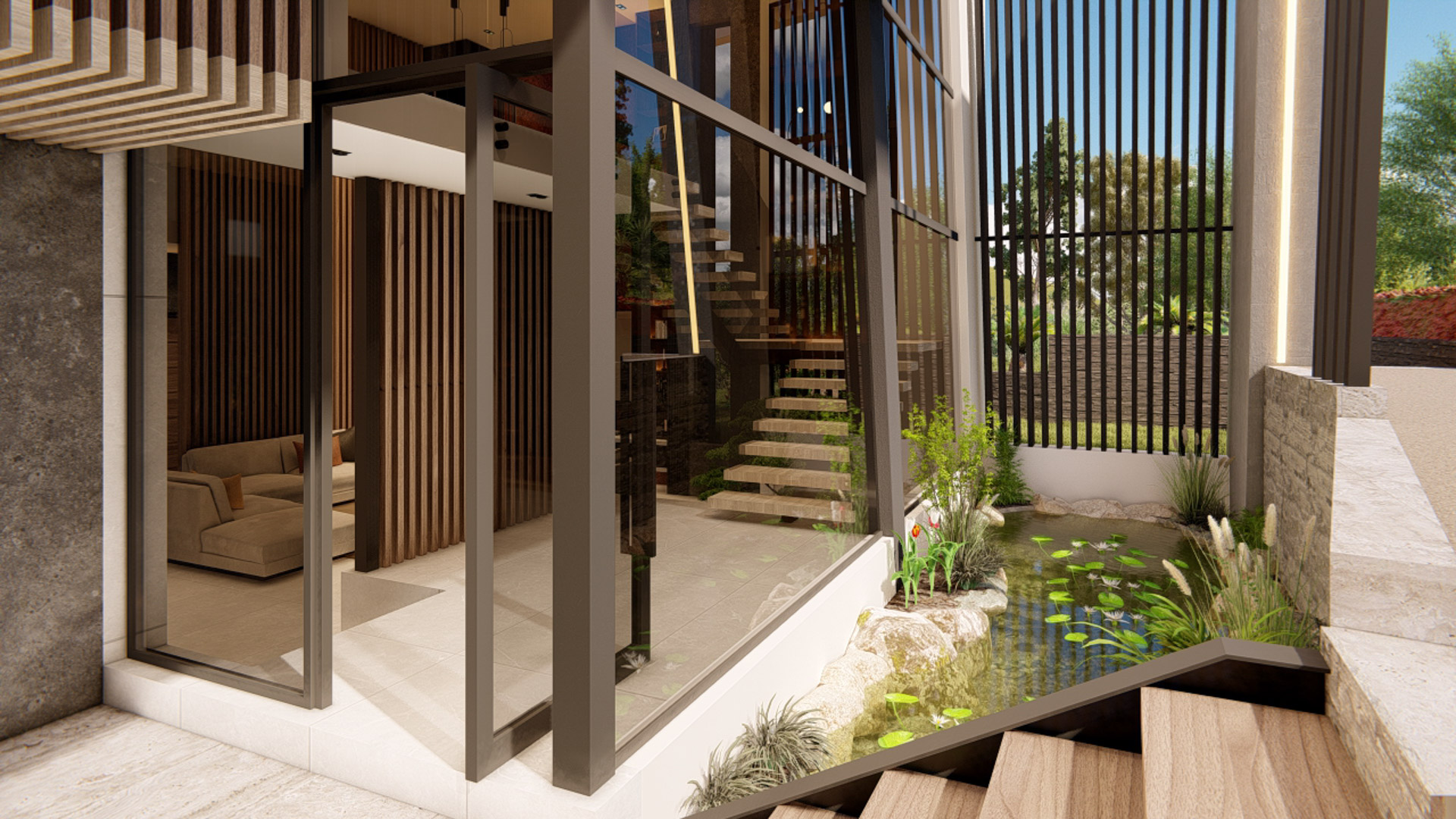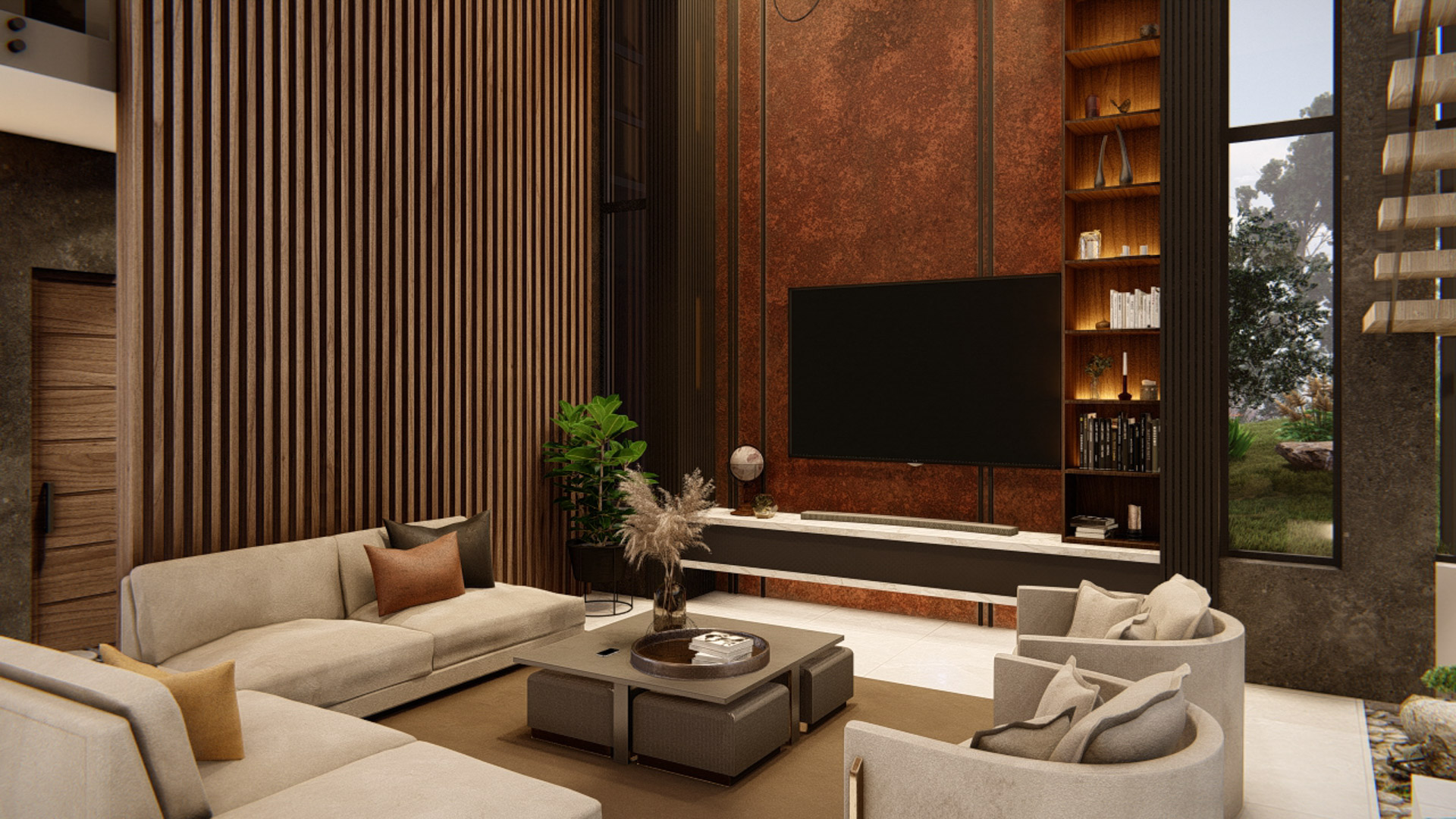 226 Mentoor Mountain Estate rises with a bold yet measured confidence, shaped by modern geometry and softened by warm, tactile materials. Positioned along the natural gradient of the mountain terrain, the home embraces its slope to create a layered living experience — where each level opens to light, long views, and the quiet rhythm of its surroundings. The architecture is defined by strong angled frames, deep overhangs, and expansive glazing that dissolves the threshold between inside and out. Timber panelling, textured stone, and sculptural steel elements introduce depth and tone, giving the façade a distinct presence without overwhelming the landscape. Inside, double-volume spaces lift the eye, while a central fireplace anchors the living areas with a rich, earthy glow. Outdoor living becomes an extension of the interior: a linear pool draws the home outward, sunken lounges invite slow afternoons, and generous terraces offer places for gathering, resting, or simply watching the mountain light shift across the day. Every detail is deliberate – from circulation flows to material contrasts – creating a home that is as expressive as it is livable.