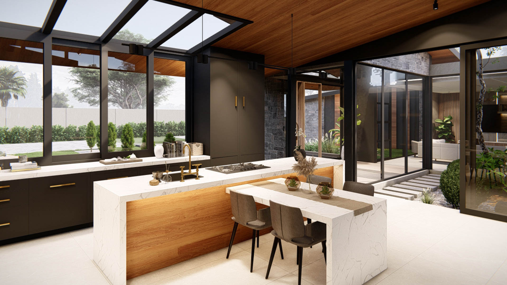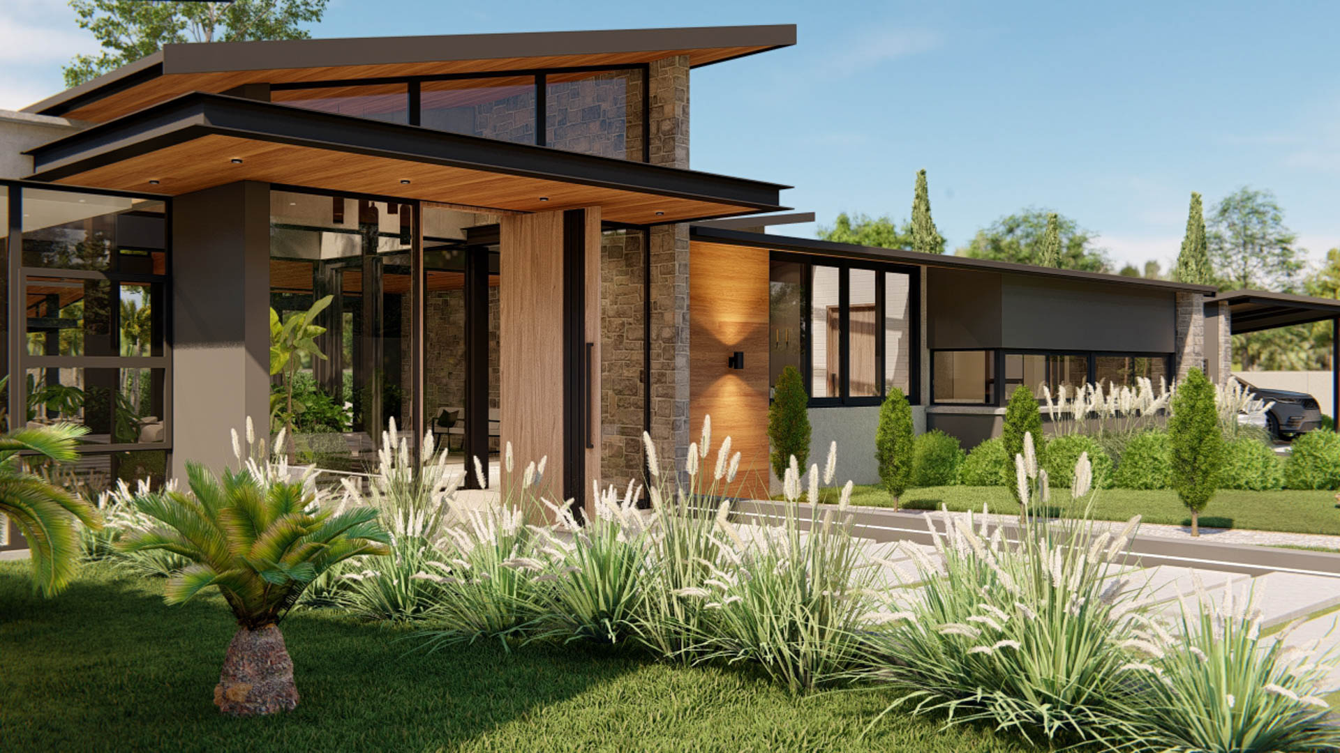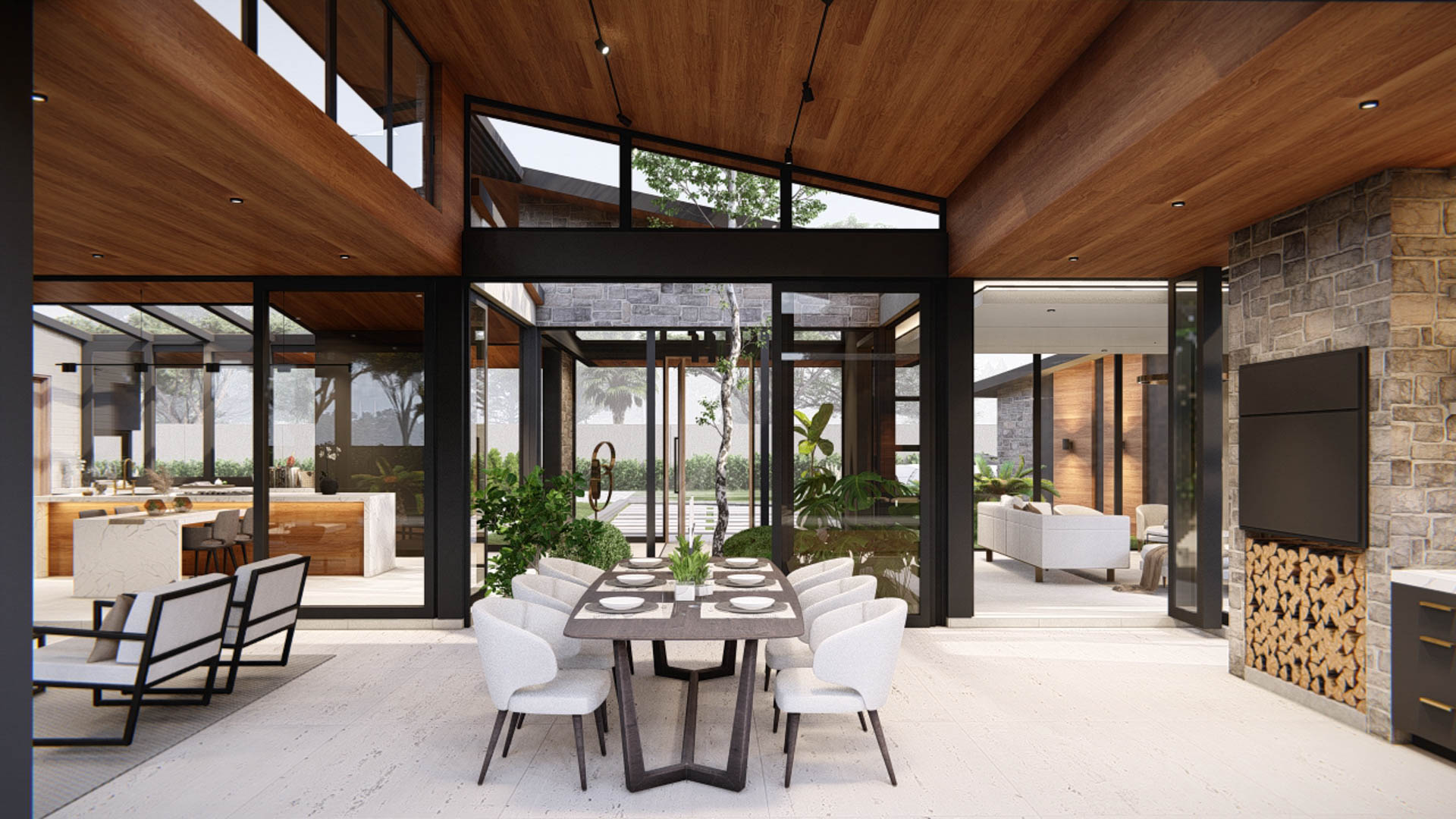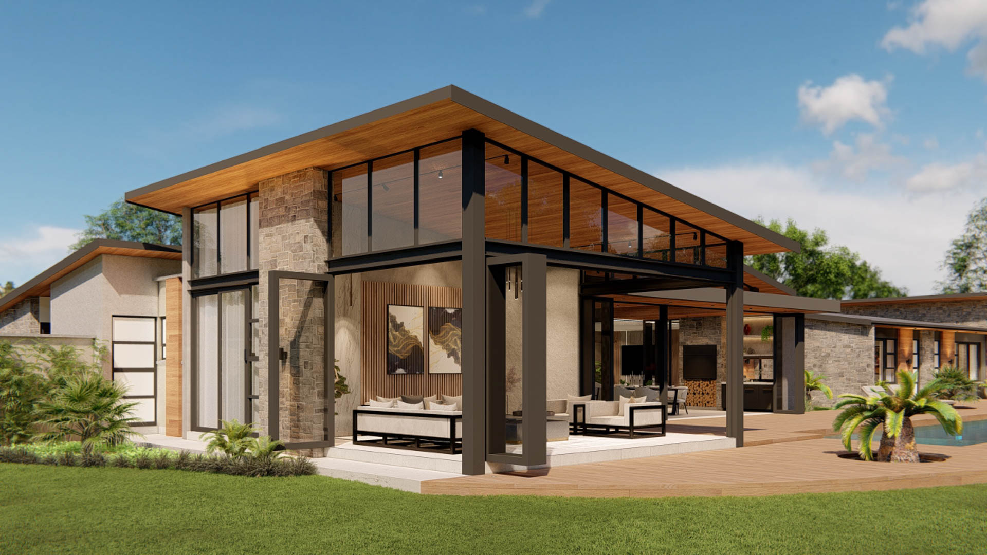 Located in Zambia, this contemporary residence is designed as a refined interpretation of modern bush-inspired architecture. The home embraces its natural surroundings through the use of stone, timber, and expansive glass, creating a seamless relationship between indoor and outdoor living. Large overhangs provide shade while enhancing the architectural form, allowing the home to respond naturally to the local climate. The residence is organised around generous outdoor living spaces, with the main living areas opening directly onto a timber pool deck and landscaped garden. At the centre of the design is an open-plan living and entertainment area that connects effortlessly to the swimming pool and boma, creating an ideal environment for both relaxed family living and outdoor gatherings.