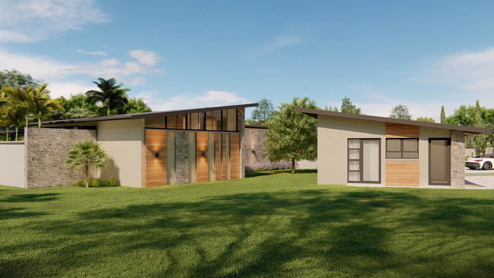 Practical elements are carefully integrated into the design, including four garages, two carports, and a guard house to ensure secure and convenient access to the property.